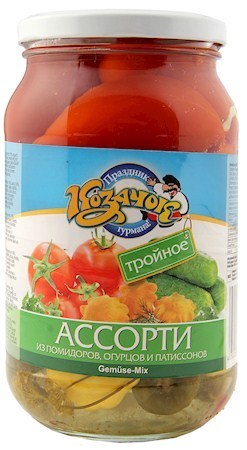 Состав: Помидоры 37%, огурцы 20%, соль, сахар, регуляторы кислотности: уксусная кислота, лимонная кислота; Острый перец, черешня пеперони,