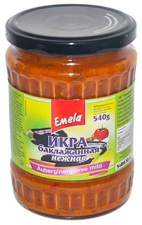 Zutaten: Auberginen 64%, Karotten, Tomatenmark, Sonnenblumenöl, Zwiebel, Zucker, Salz, Petersilie, Säuerungsmittel Glucono-delta-Lacton, Paprika.