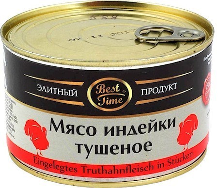 Состав: Турция мясо 65%, вода, загуститель каррагинан, стабилизаторы: гуаровая камедь, трифосфаты; Соль, глюкоза, мальтодекстрин, Регулятор кислотности: карбонат натрия, специи (черный перец, лавровый лис)