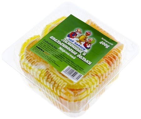 Состав:Сахар, инвертный сахарный сироп, белковый порошок (яичный белок) желирующий агент, агар-агар, подкислитель лимонная кислота, ароматизатор, красители: Е 102, Е 110.