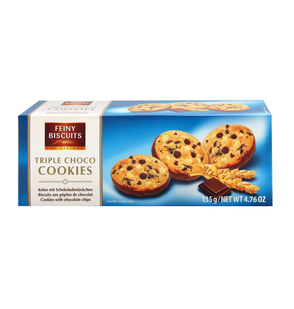 Состав:Пшеничная мука, растительные жиры (пальмовые, рапсовые), сахар, молочная шоколадная стружка 12% [сахар, сухое цельное молоко, какао-масло, какао-масса, лактоза, сухая сыворотка (из молока), эмульгатор: Е322 (соя)], шоколадная стружка 8% [сахар, какао-масса, какао-масло, эмульгатор: Е322 (соя)], белая шоколадная стружка 8% [сахар, сухое цельное молоко, какао-масло, сухое обезжиренное молоко, эмульгатор: Е322 (соя); ароматизатор], крахмал, овсяная мука, сухое обезжиренное молоко, глюкозно-фруктозный сироп (из пшеницы), разрыхлитель: е503; пищевая соль, ароматизатор.