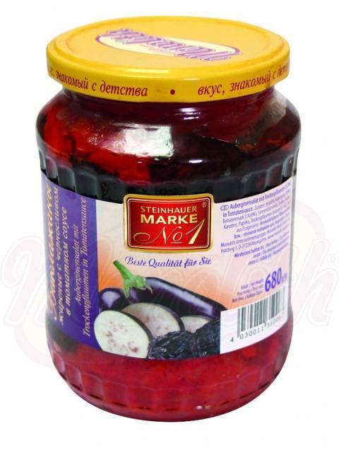 Zutaten: gegrillte Auberginen (48%), Tomatenmark (14,6), Sonnenblumenöl, Zucker, Zwiebel, Karotten, Paprika, Trockenpflaumen (entsteint), Salz, Essig aus Essigessenz.