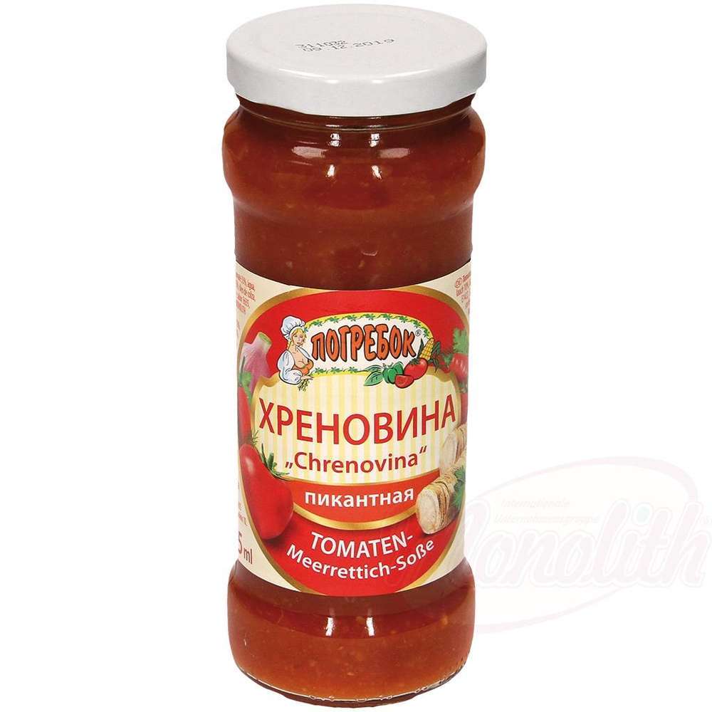 Состав: помидоры 33%, вода, чеснок 10%, хрен 7%, острый перец 6%, томатная паста 5%, рапсовое масло, модифицированный крахмал, соль, регулятор кислотности лимонная кислота, консерванты Е202, Е211.