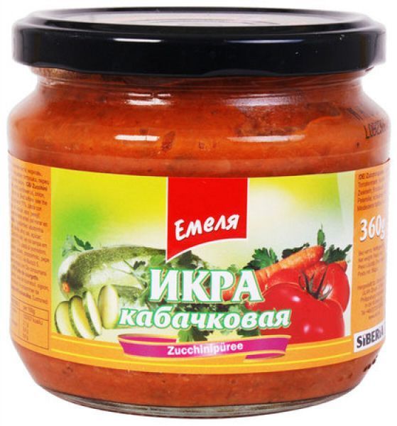 Состав: Кабачки 75%, морковь, томатная паста, масло подсолнечное, лук, сахар, соль, чеснок, петрушка, подкислитель лимонная кислота, перец, сельдерей, черный перец, фенхель.